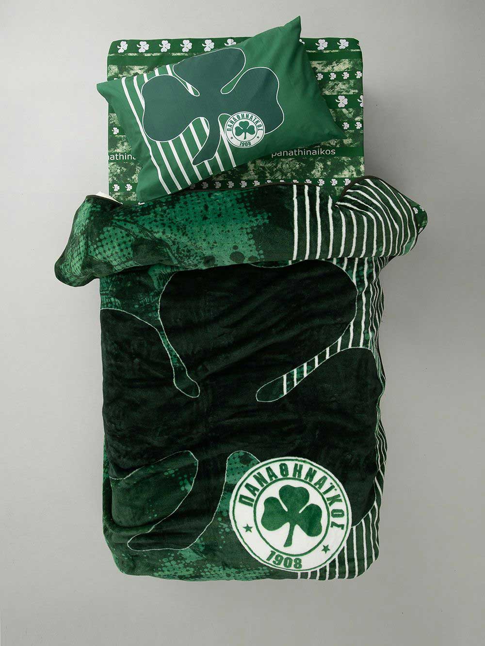 Μονή βελουτέ κουβέρτα από την σειρά Official Team Panathinaikos F.C. Collection, της εταιρίας Palamaiki. Ζεστή και βελούδινα απαλή, στα χρώματα της αγαπημένης σας ομάδας, θα σας χαρίσει απολαυστικές στιγμές χαλάρωσης.Οι σωστοί φίλαθλοι δείχνουν την αγάπη τους για την ομάδα τους και στο σπίτι και όχι μόνο στο γήπεδο. Ντύστε το υπνοδωμάτιό σας με τα χρώματα της αγαπημένης σας ομάδας και ζεσταθείτε με την βελουτέ κουβέρτα του Παναθηναϊκού!