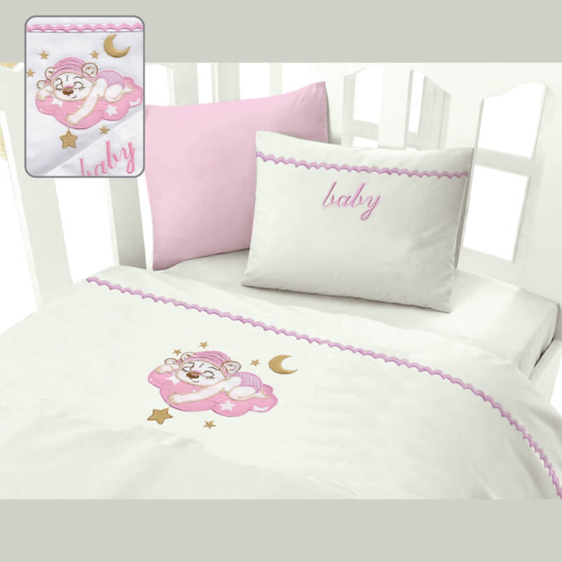 Σετ βρεφικά σεντόνια για την κούνια του μωρού σας με κέντημα ζωάκι. Η σύνθεσή τους είναι από 100% βαμβακερά νήματα ειδικά επεξεργασμένα για να αντέχουν στο χρόνο διατηρώντας την απαλότητά τους κ προσφέροντας στο μωρό σας έναν ήρεμο και ποιοτικό ύπνο χειμώνα-καλοκαίρι.